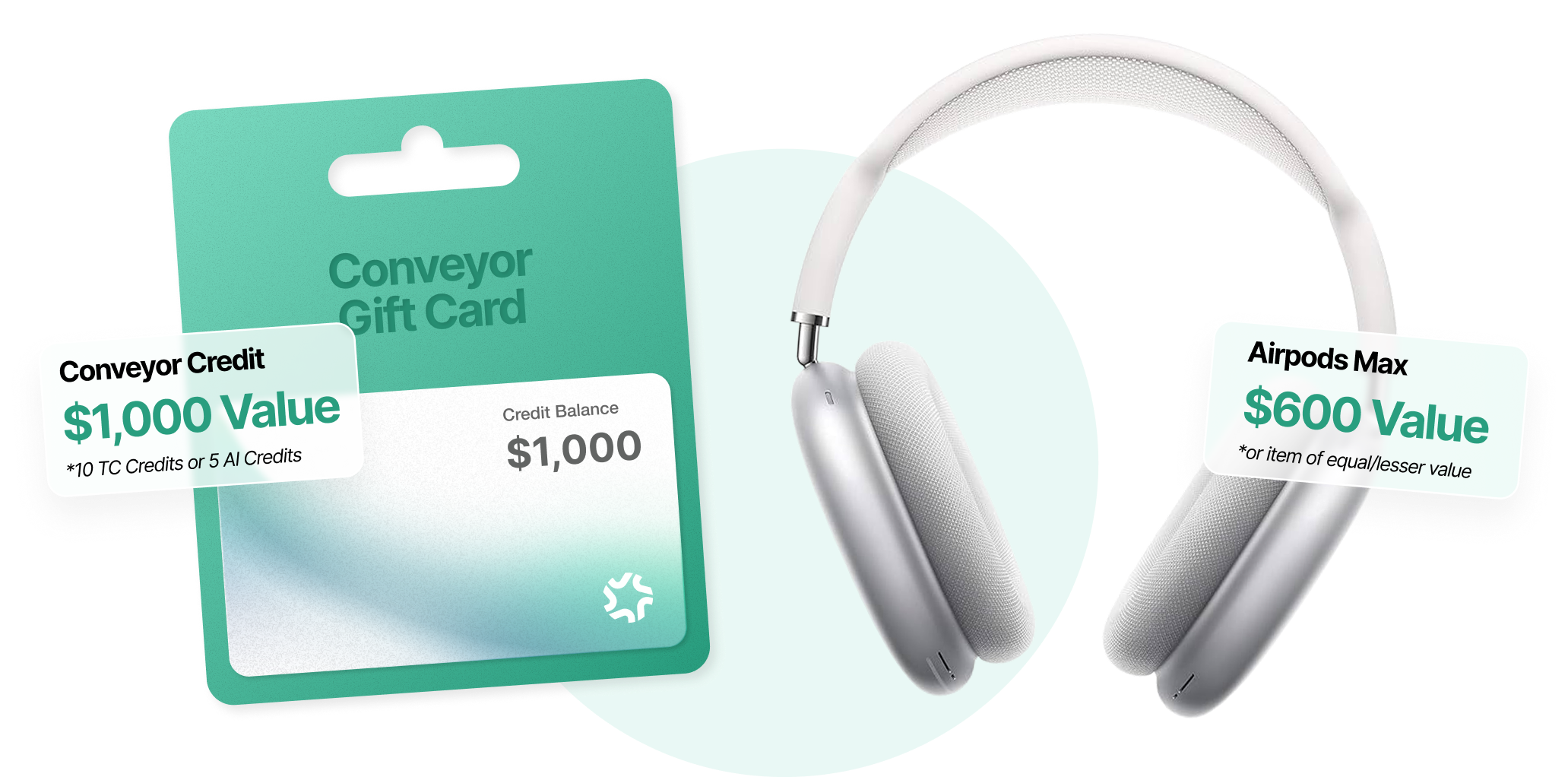 Receive your choice of: Up to $1,000 in contract credits (10 free TC credits or 5 free AI credits) or Airpod Max's ($600 value)/equivalent value gift for every referred company that becomes a Conveyor opportunity*.